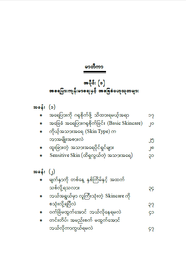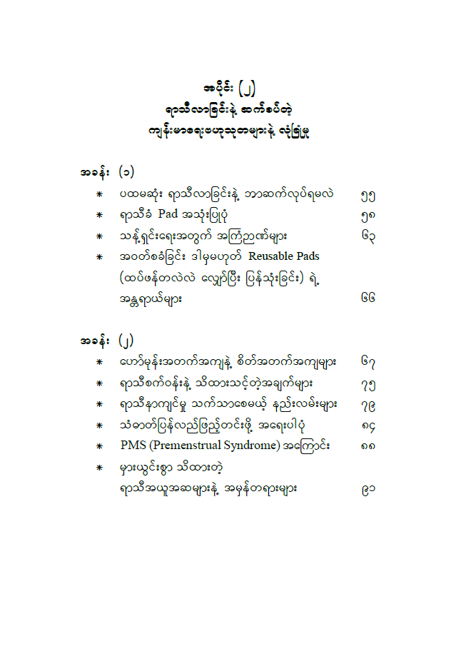 ✅ ယုံကြည်မှုအပြည့်နဲ့ ရင့်ကျက်တဲ့ အမျိုးသမီးတစ်ဦးအဖြစ် ကြီးပြင်းလာဖို့အတွက် ဒီစာအုပ်မှာ အလှအပနဲ့ အရေပြား ထိန်းသိမ်းနည်းတွေ၊ ခန္ဓာကိုယ် ကျန်းမာရေးနဲ့ ရာသီလာခြင်းနဲ့ဆိုင်တဲ့ အကြောင်းအရာတွေ၊ တစ်ကိုယ်ရည်သန့်ရှင်းမှုနဲ့ အနံ့အသက် ကင်းစင်စေတဲ့နည်းလမ်းတွေ၊ ဘဝရဲ့အရေးကြီးဆုံးသော ဆုံးဖြတ်ချက်တွေကို စိတ်ခံစားမှုထက် ဉာဏ်ပညာနဲ့ ချင့်ချိန်စဥ်းစားနိုင်အောင် ရိုးရှင်းတဲ့ အကြံပြုချက်များ ပါ၀င်ပါတယ်။