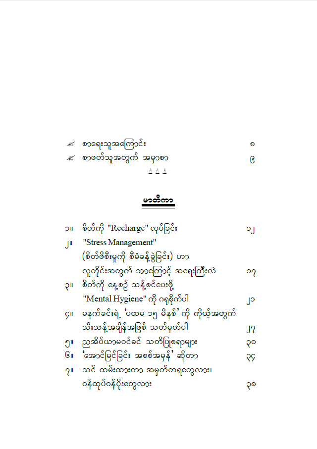 ■ စိတ်ကို Recharge လုပ်ပေးဖို့ လျစ်လျူမရှုဘဲ ကိုယ့်စိတ်ကို ကိုယ်တိုင် အားဖြည့်ပေးနိုင်ဖို့ "Recharge Your Mind" စာအုပ်က သင့်ဘဝအတွက် အကောင်းဆုံး လမ်းပြမြေပုံ ဖြစ်လာပါလိမ့်မယ်။
