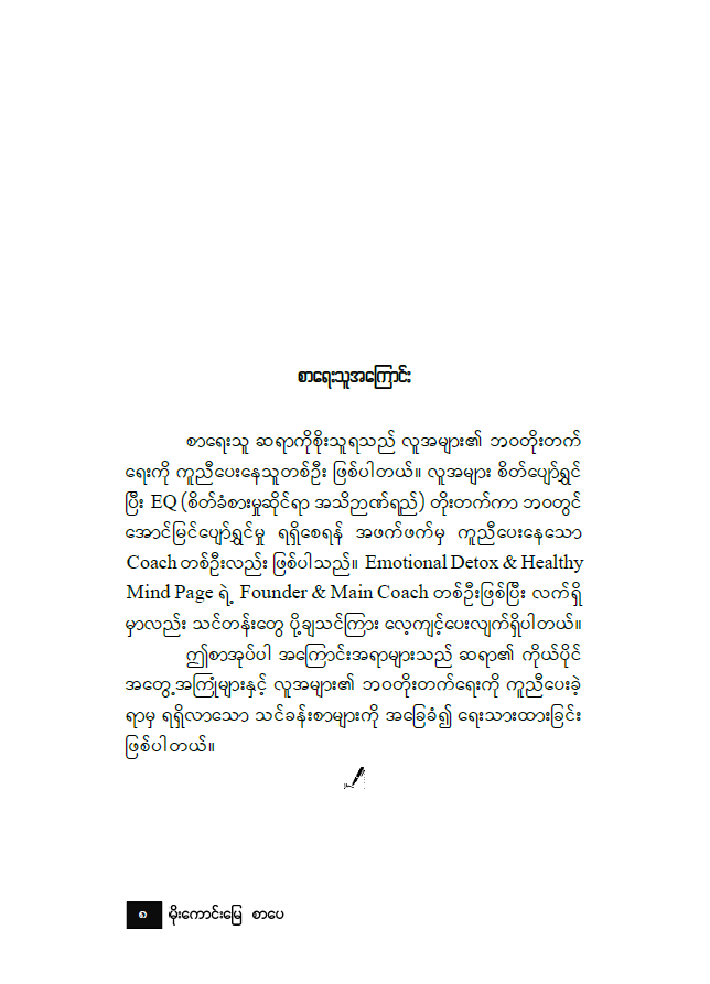 ■ သင့်စိတ်ကို အားပြန်ဖြည့်ပြီး ဘဝခရီးလမ်းကို စိတ်ခွန်အား အပြည့်နဲ့ စိတ်ကြည်လင်လန်းဆန်းစွာ ဆက်လက်လျှောက်လှမ်းနိုင်ဖို့ မဖြစ်မနေ ဖတ်ရှုသင့်တဲ့ စာအုပ်ကောင်းတစ်အုပ် ဖြစ်ပါတယ်။
