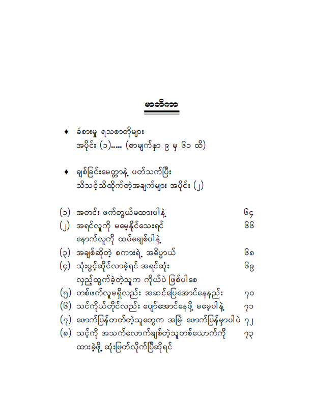 ဒီစာအုပ်လေးက အလွမ်းအဆွေး ဓာတ်ခံရှိတဲ့သူတွေနဲ့ ချစ်ခြင်းမေတ္တာနဲ့ ပတ်သက်ပြီး ဘယ်လို စိတ်နေစိတ်ထားမျိုး ထားရမလဲဆိုတာ သိဖို ကြိုးစားနေတဲ့ သူတွေအတွက် အပိုင်း ( ၂ ) ပိုင်းခွဲပြီး ရေးသားထားပါတယ်။
