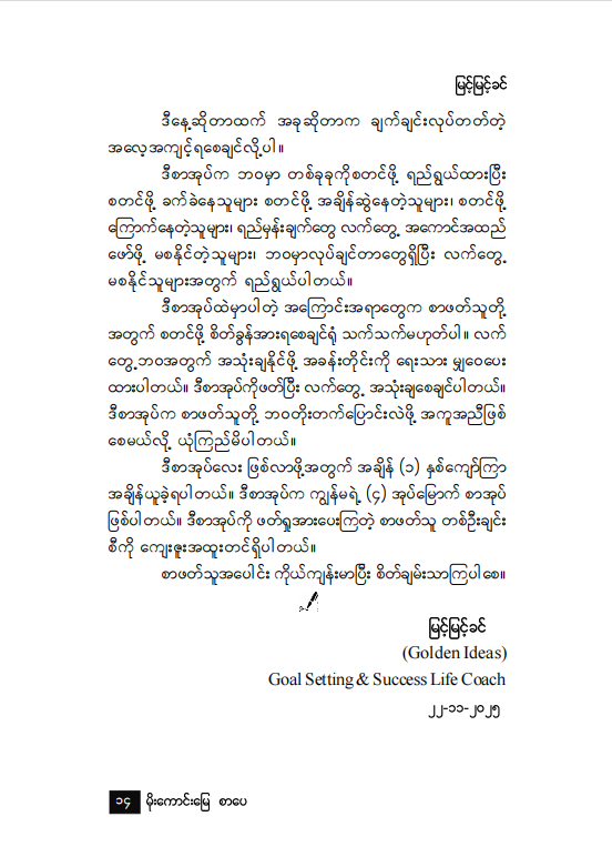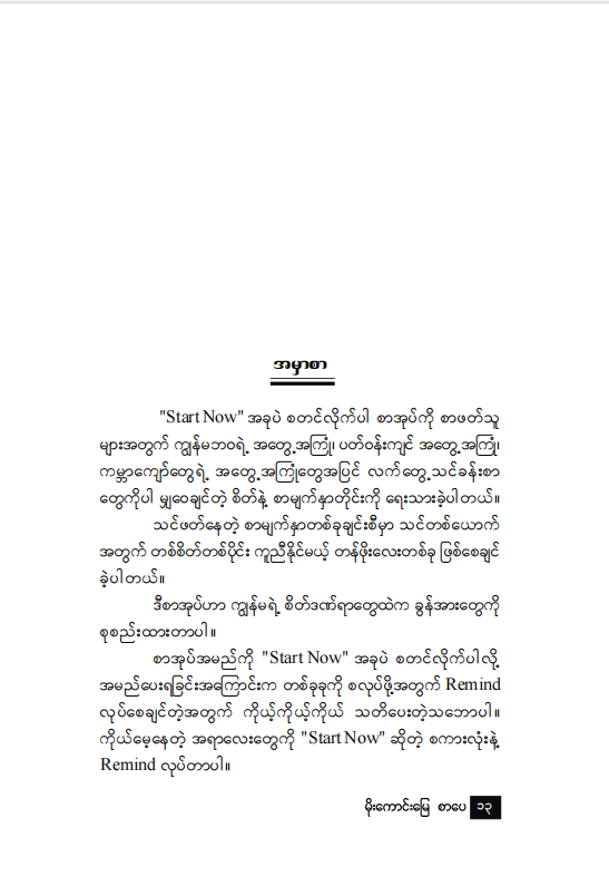 ဒီ Start Now စာအုပ်ဟာ သင့်ကို စိတ်ကူးယဉ်ဖို တိုက်တွန်းနေမှာ မဟုတ်ဘဲ လက်တွေ့လုပ်ဆောင်နိုင်မယ့် Roadmap တွေကို ပေးသွားမှာပါ။
