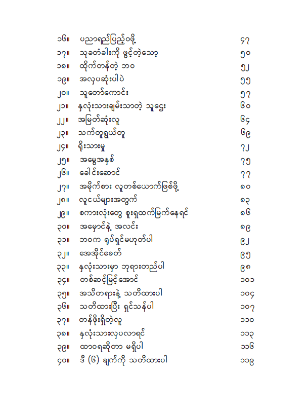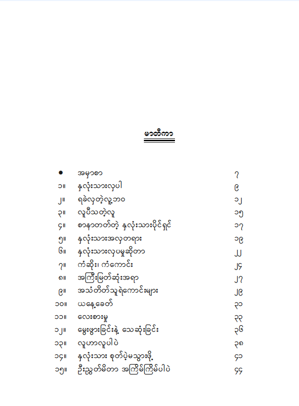စာကြောင်းအချိတ်အဆက်တွေ မိချင်မှ မိပါလိမ့်မယ်။ ဒါပေမဲ့ ကျွန်တော်တိုရဲ့ နှလုံးသား၊ ကျွန်တော်တိုရဲ့ စိတ်နေစိတ်ထားနဲ့ ကျွန်တော်တို ဘယ်လိုလူမျိုးဖြစ်နေသလဲ၊ ကျွန်တော်တို ဘယ်လိုလူမျိုး ဖြစ်ချင်တာလဲ၊ ကျွန်တော်တို ဘယ်လိုလူမျိုး ဖြစ်နေပြီလဲဆိုတာကို ဒီစာအုပ်လေးက မေးခွန်းထုတ်ပါလိမ့်မယ်။